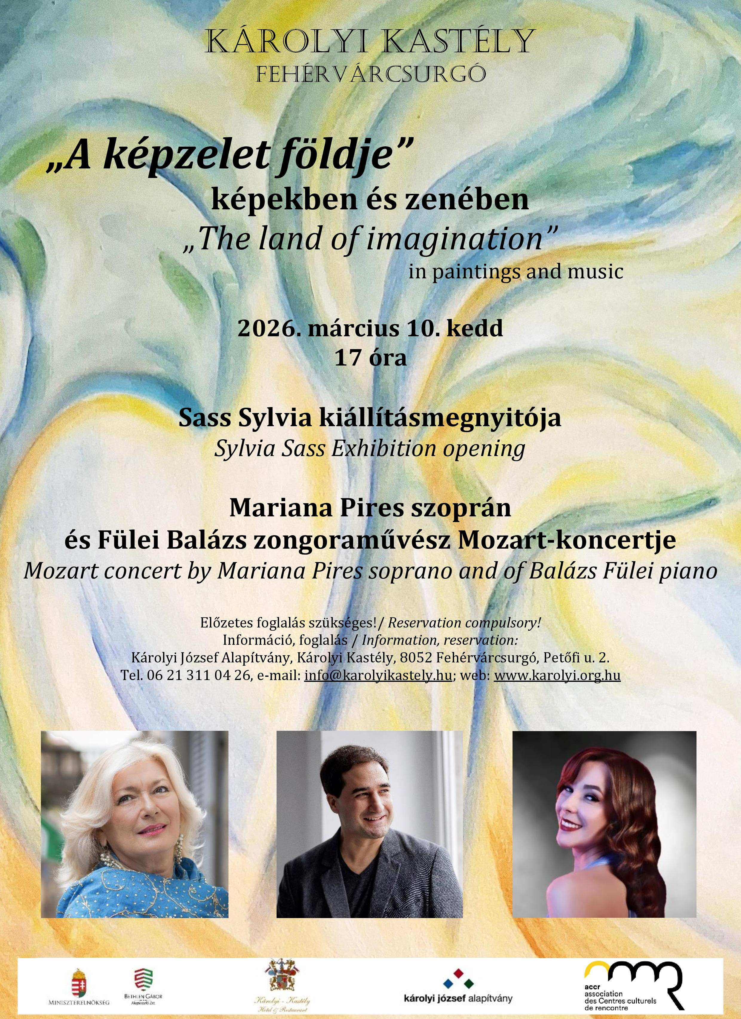 A fehérvárcsurgói Károlyi Kastély Látogatóközpontjában március 10-én, kedden Sass Sylvia "A képzelet földje" című tárlatának megnyitóját Mariana Pires és Fülei Balázs koncertje követi.